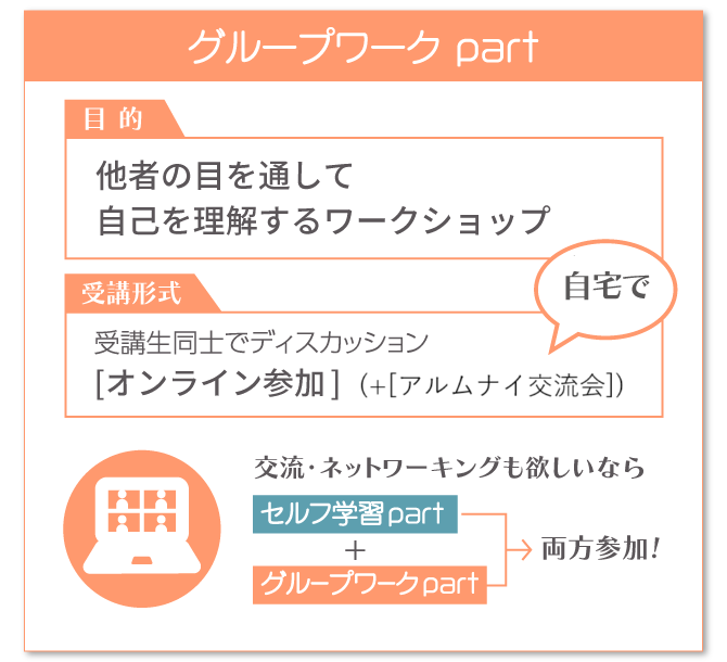 ※【グループワークpart】は原則参加推奨ですが、【セルフ学習part】だけでも[知命塾]のノウハウは一通り学べますので任意で大丈夫です。