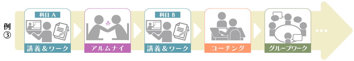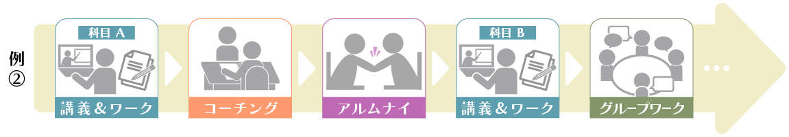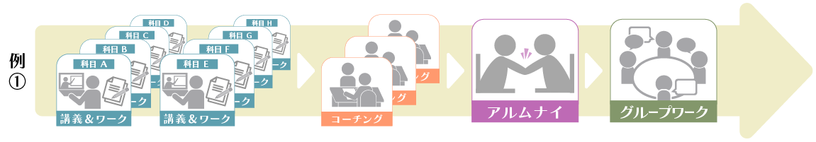 講義&ワークすべて完了させてからでも(例①)、講義&ワークを受けつつコーチングを受けても(例2)、まずはアルムナイの会に参加すること(例③)も可能です。