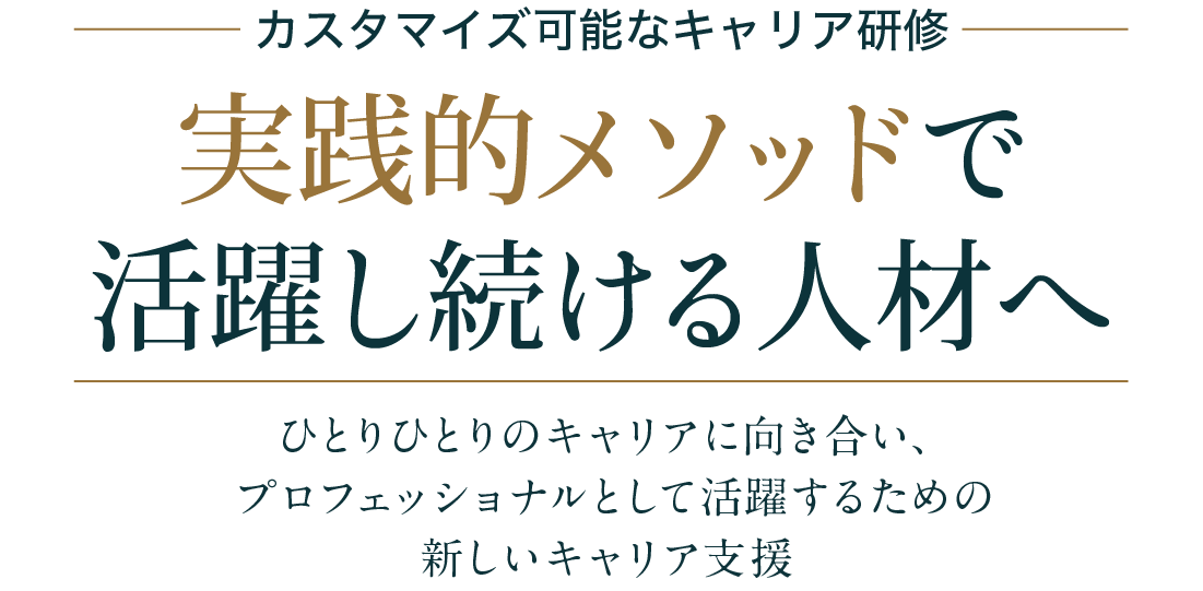 当社では長年に亘り培ったノウハウを利用して40代、50代のいわゆるミドル・シニア世代社員の方に、社内外を問わず広い視野から主体的にキャリアを切り拓く意識とそこで活躍するプロとしての意識を身につけるための研修をはじめとしたサービス群をご提供いたします。